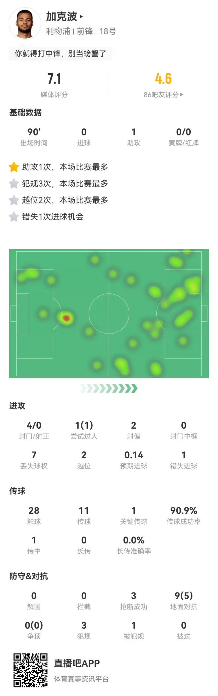 4月12日讯 利物浦在本轮英超对阵富勒姆,加克波本场数据如下:
