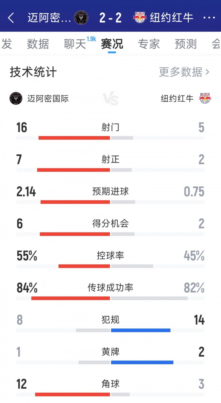 4月12日讯 在本轮美职联,迈阿密国际2-2战平纽约红牛。以下为双方全场数据对比: