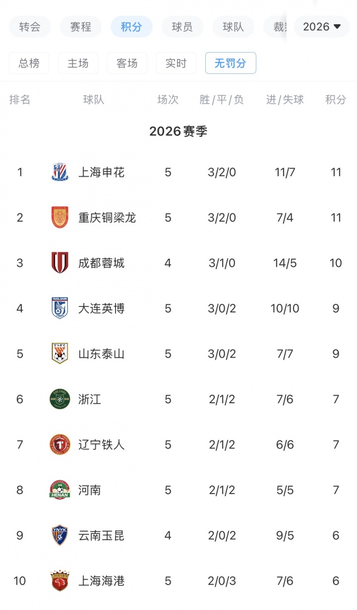 -10分起步的申花目前拿到1分排在第10,若无罚分申花目前领跑中超。