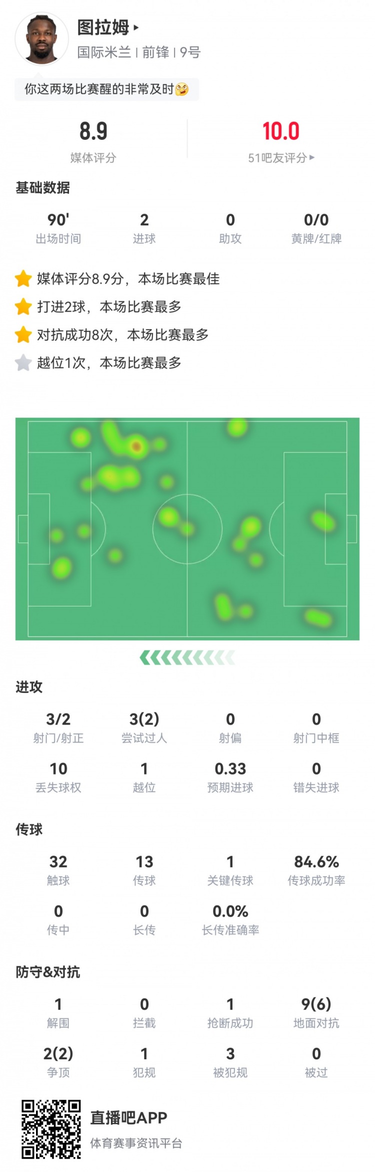 关键先生!图拉姆数据:3射2正2进球1关键传球,评分8.9全场最高