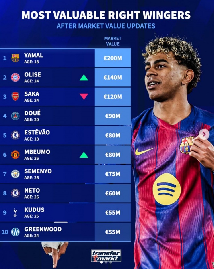 4月13日讯 德转更新了足坛右边锋身价情况,亚马尔以2亿欧居首,奥利塞以1.4亿欧位居次席。