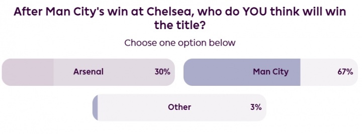 最新的投票结果显示,现在仅有30%的球迷看好目前榜首的阿森纳夺冠,而有67%的球迷认为曼城最终将反超阿森纳夺魁。另外还有3%的人认为,冠军将从其他球队当中产生。