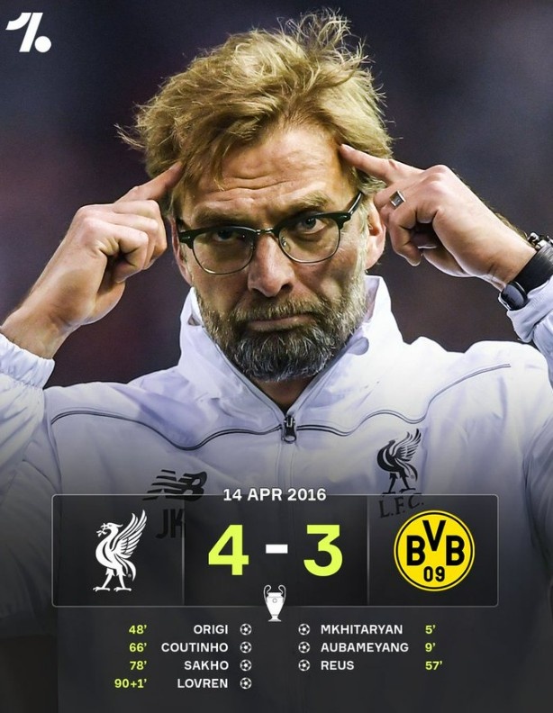 在双方首回合较量中,利物浦客场1-1战平多特,回到主场利物浦开局不佳,10分钟过后就两球落后,奥里吉在第48分钟扳回一球,但是罗伊斯再度扩大领先优势。随后利物浦展开疯狂反扑,第66分钟、78分钟分别由库蒂尼奥和萨科破门扳平比分,最终在91分钟由洛夫伦完成绝杀。
