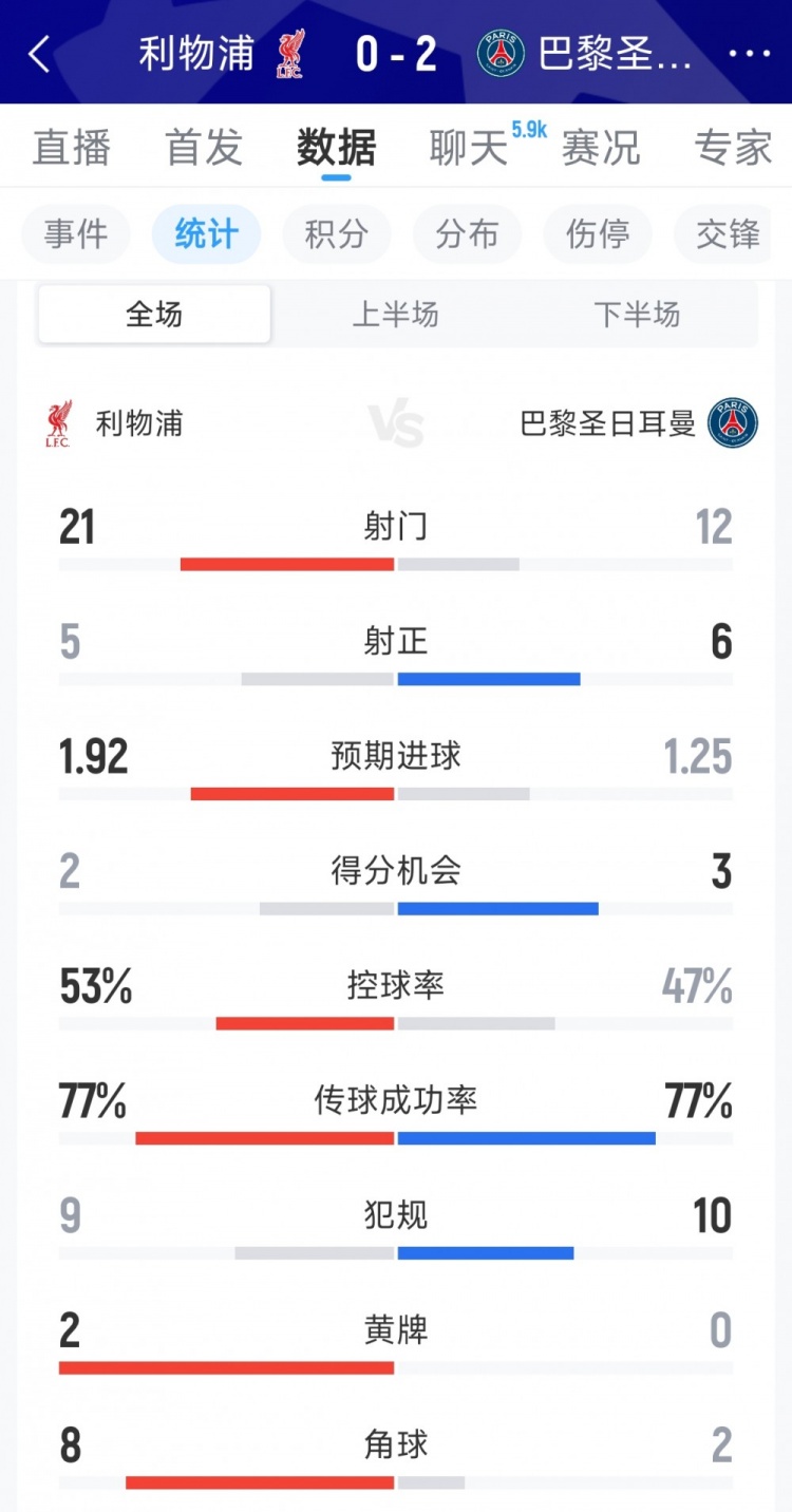 4月15日讯 在欧冠淘汰赛次回合,巴黎客场2-0击败利物浦,以下为双方全场数据对比: