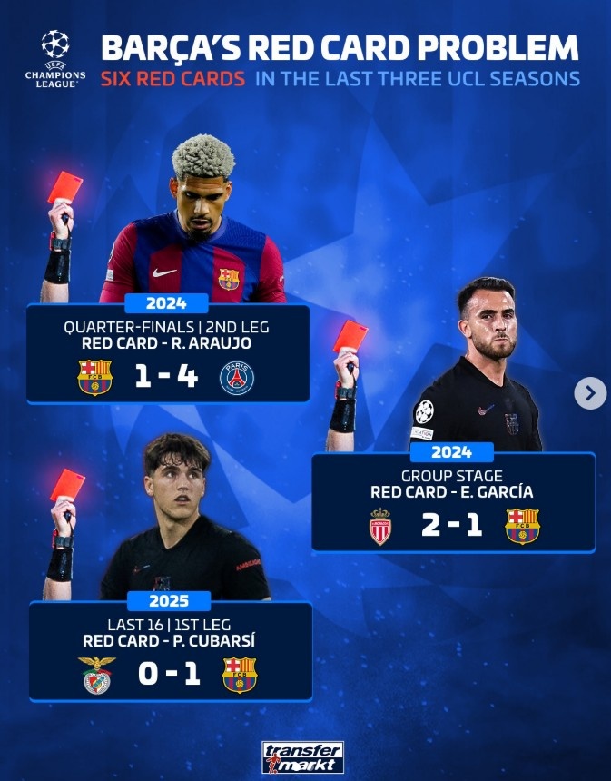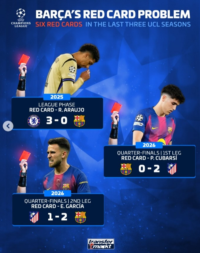 4月15日讯 在欧冠淘汰赛次回合,巴萨2-1击败马竞,加西亚吃到红牌,这是巴萨近3个赛季在欧冠吃到的第6张红牌,以下为具体情况: