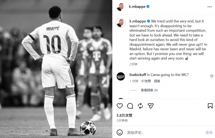 04月17日讯 皇马在欧冠1/4决赛被拜仁淘汰,姆巴佩赛后发表社媒。