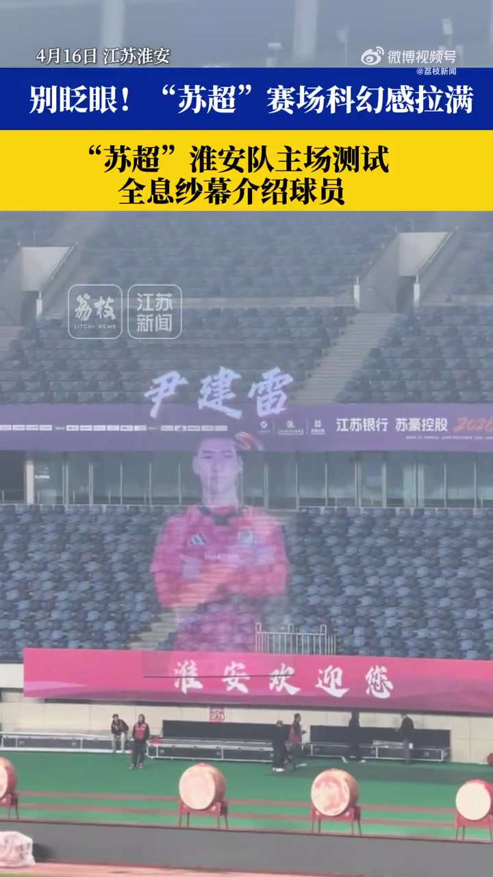 4月17日讯 据“荔枝新闻”报道,近日,“苏超”淮安队主场淮安市体育中心测试启用全息纱幕介绍出场球员,科幻感拉满!