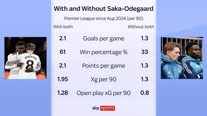 天空体育数据统计显示,自2024年8月以来,当萨卡和厄德高同时出战时,阿森纳英超场均打进2.1球、胜率61%、场均2.1分、预期进球值1.95、运动战预期进球值1.28。