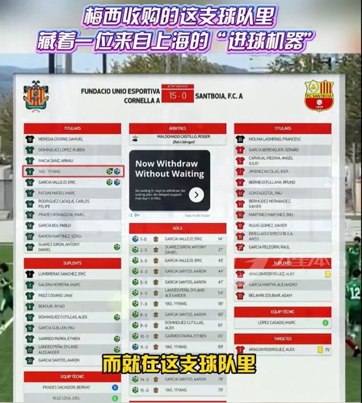 其中在加泰U15联赛第25轮中,姚奕仰单场轰进4球,率队15比0狂胜森特堡亚。而上赛季姚奕仰在U14联赛29场29球拿金靴。