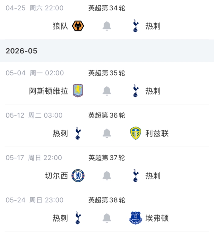 热刺剩余赛程: