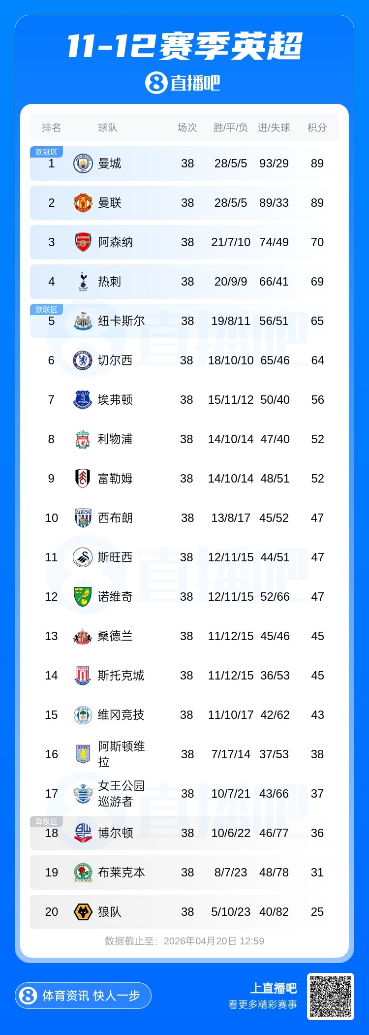 以净胜球夺冠仅1次!11/12赛季曼城曼联同积89分,阿圭罗9320绝杀
