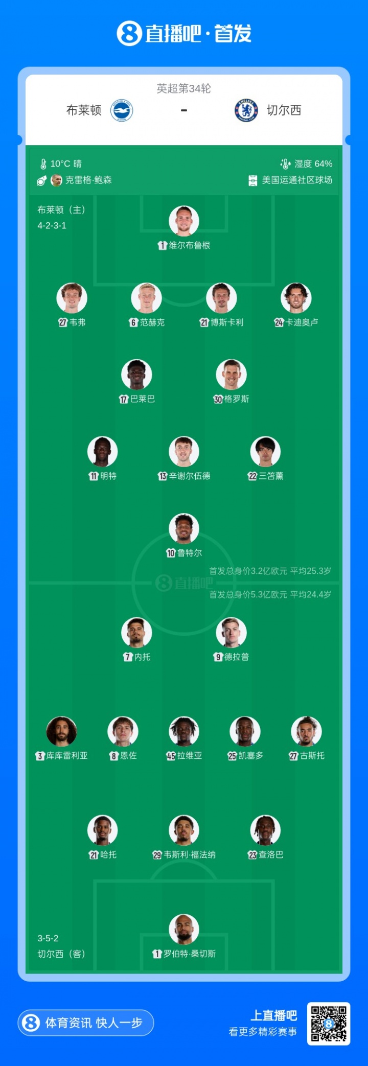 布莱顿首发:1-维尔布鲁根、6-范赫克、21-博斯卡利、24-卡迪奥卢、13-辛谢尔伍德、17-巴莱巴、27-韦弗、30-格罗斯、10-鲁特尔、11-明特、22-三笘薰