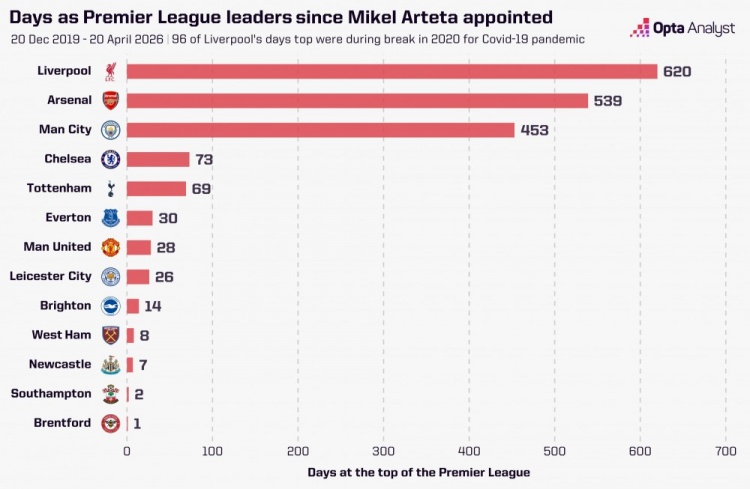 自2019年12月上任以来,阿尔特塔麾下的阿森纳在英超榜首的天数为539天,仅次于620天的利物浦。不过,利物浦在积分榜上领跑的天数包含了2020年因疫情导致联赛停摆的接近100天。
