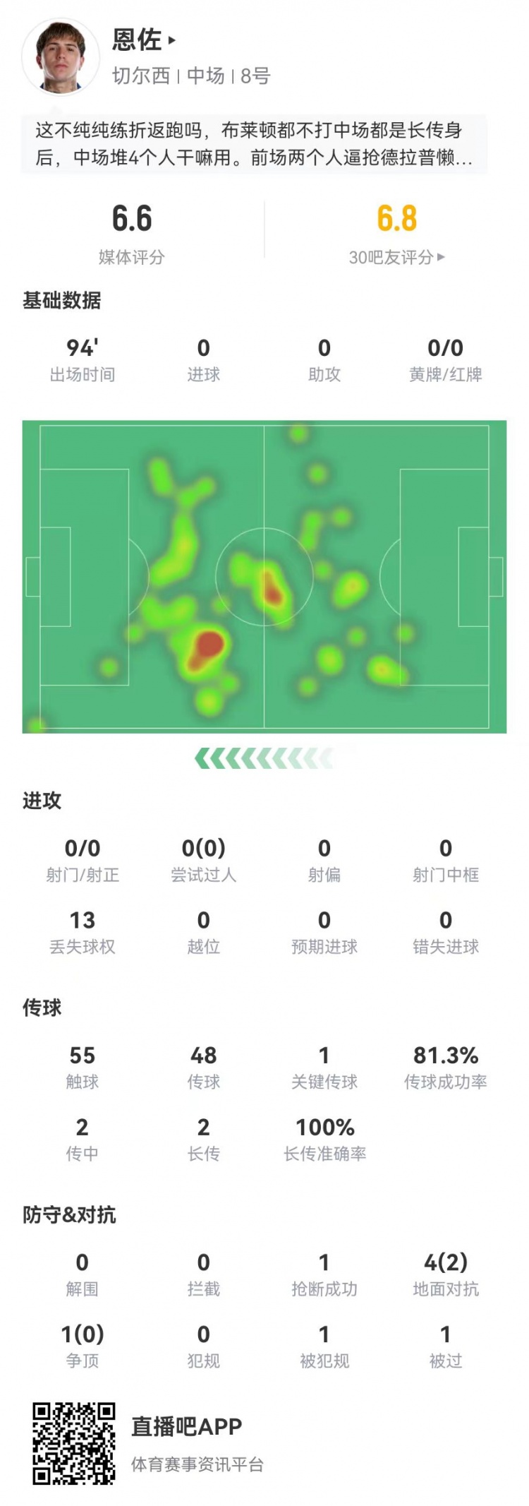 4月22日讯 切尔西在本轮英超对阵布莱顿,恩佐本场数据如下: