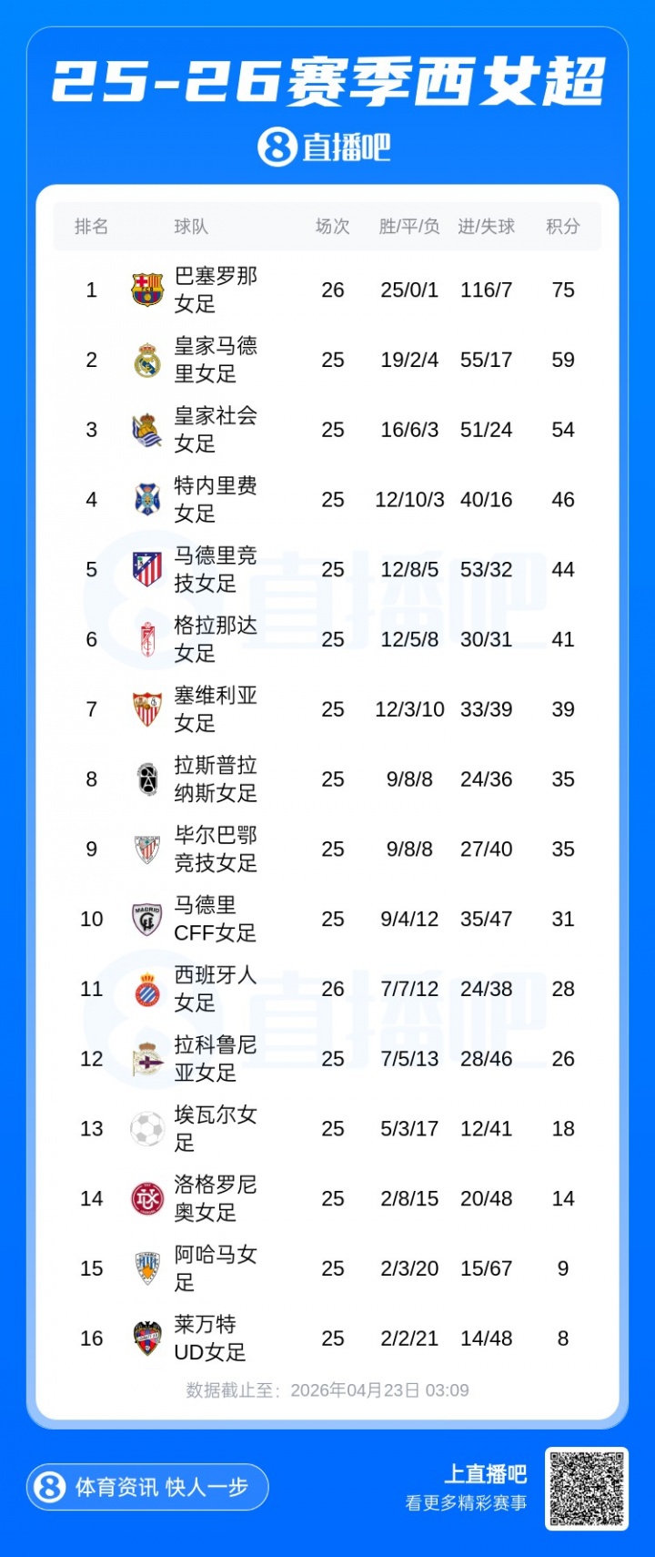 本赛季至今,巴萨女足在联赛中进行26轮比赛,豪取25胜,只有一场失利。此外她们的联赛进球和丢球数也是极为恐怖的116/7。