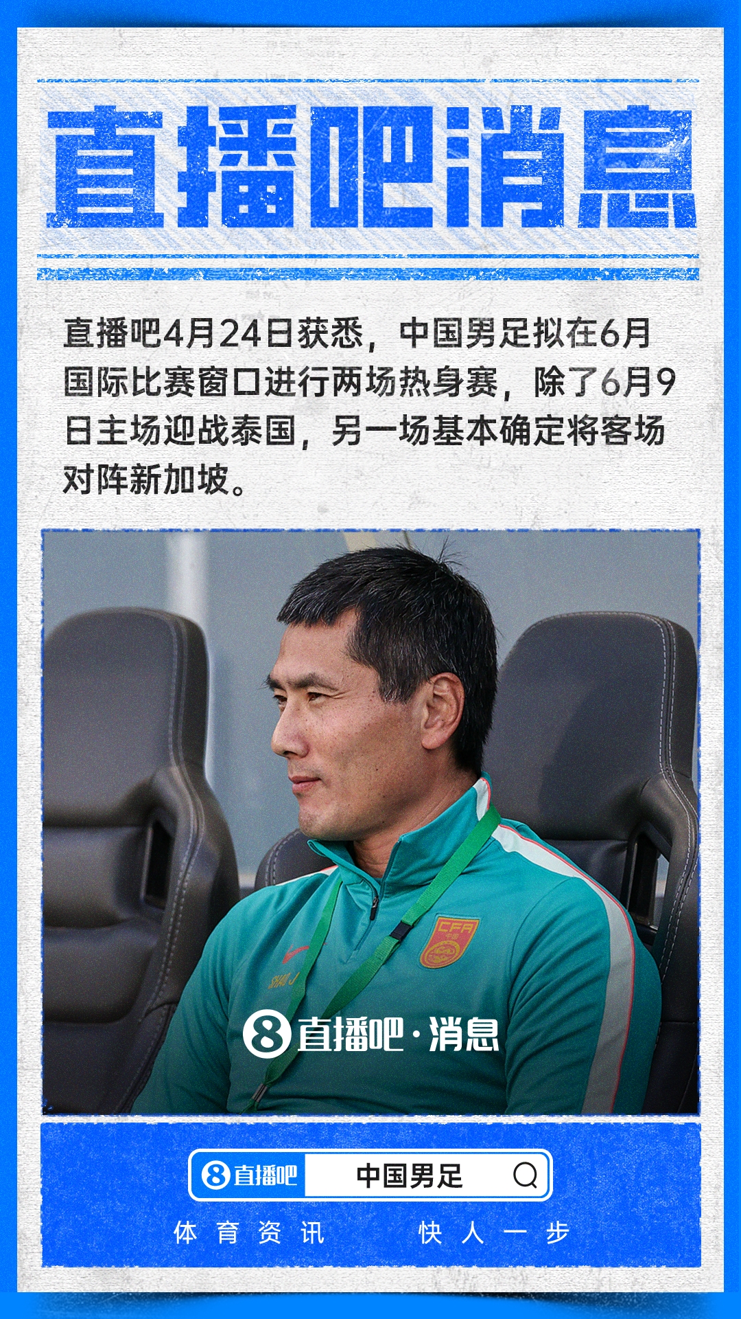 直播吧:国足6月首场热身赛拟客场对阵新加坡