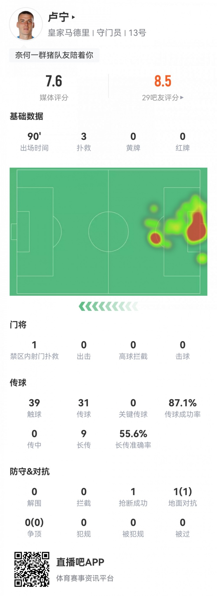 4月25日讯 本轮西甲,皇马1-1贝蒂斯。此役皇马门将卢宁首发打满全场发挥出色,球员全场重点数据如下↓