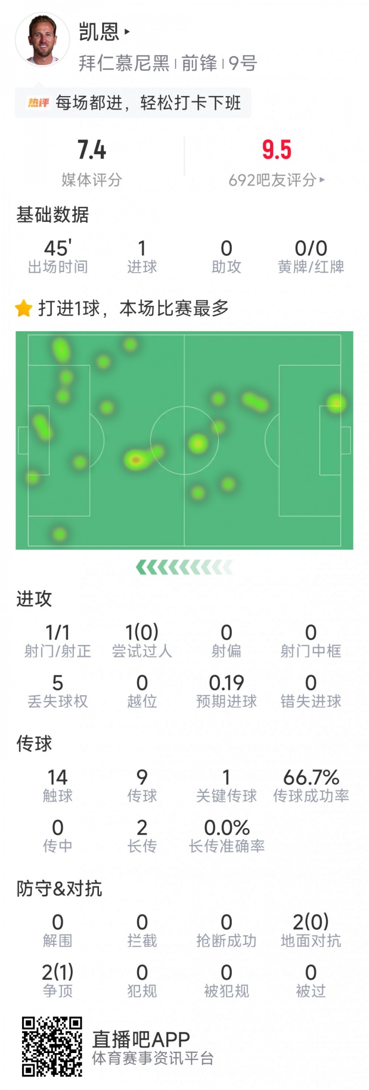4月25日讯 在本轮德甲,拜仁4-3逆转击败美因茨,凯恩替补登场破门,以下为他在本场数据: