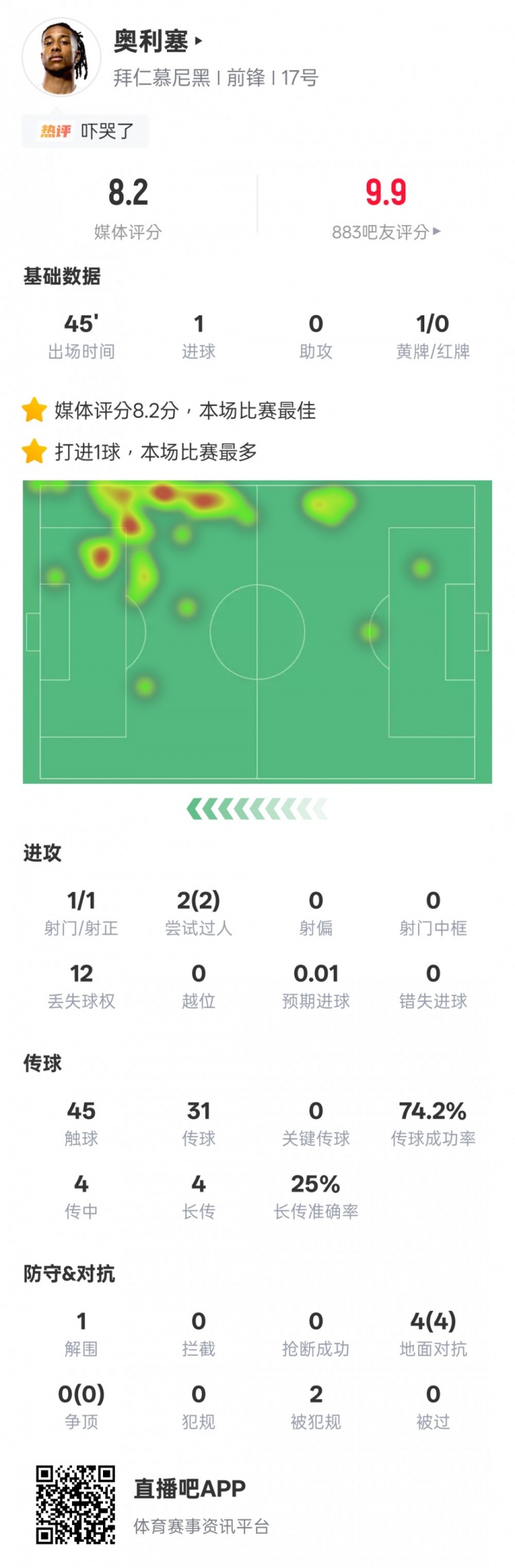 4月25日讯 德甲第31轮,拜仁4-3美因茨。奥利塞替补登场,打进1粒进球,2次过人成功,评分8.2全场最高。