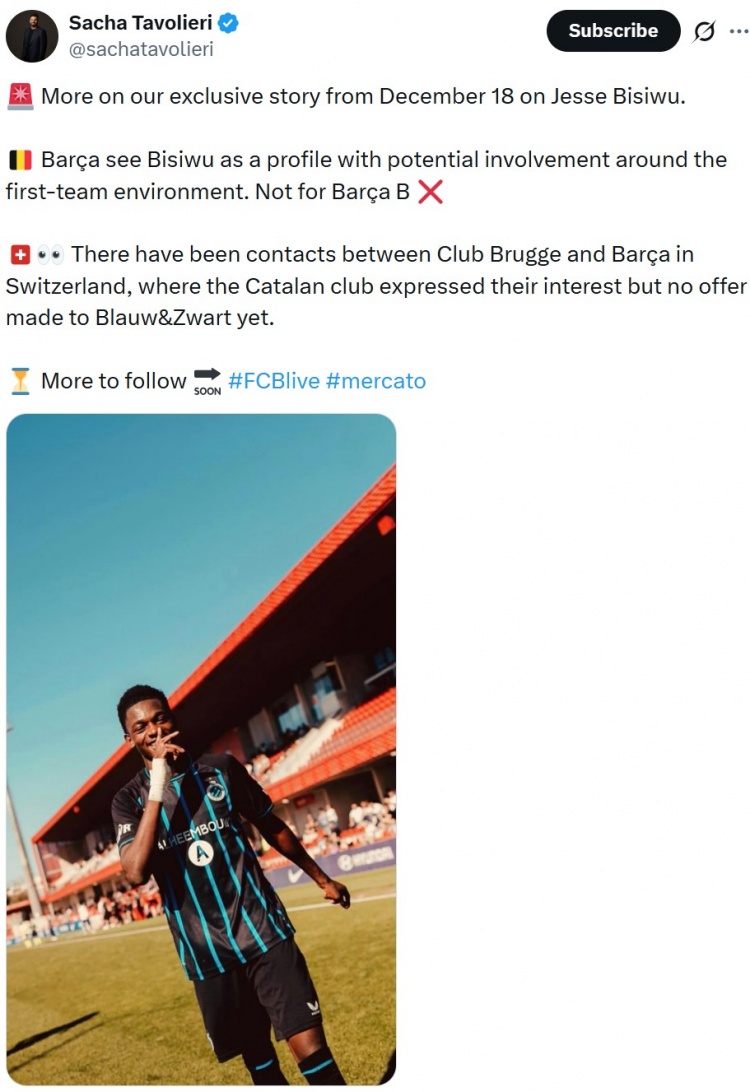 4月25日讯 据记者Sacha Tavolieri报道,巴塞罗那对布鲁日球员杰西·比希乌感兴趣,但尚未提出正式报价。