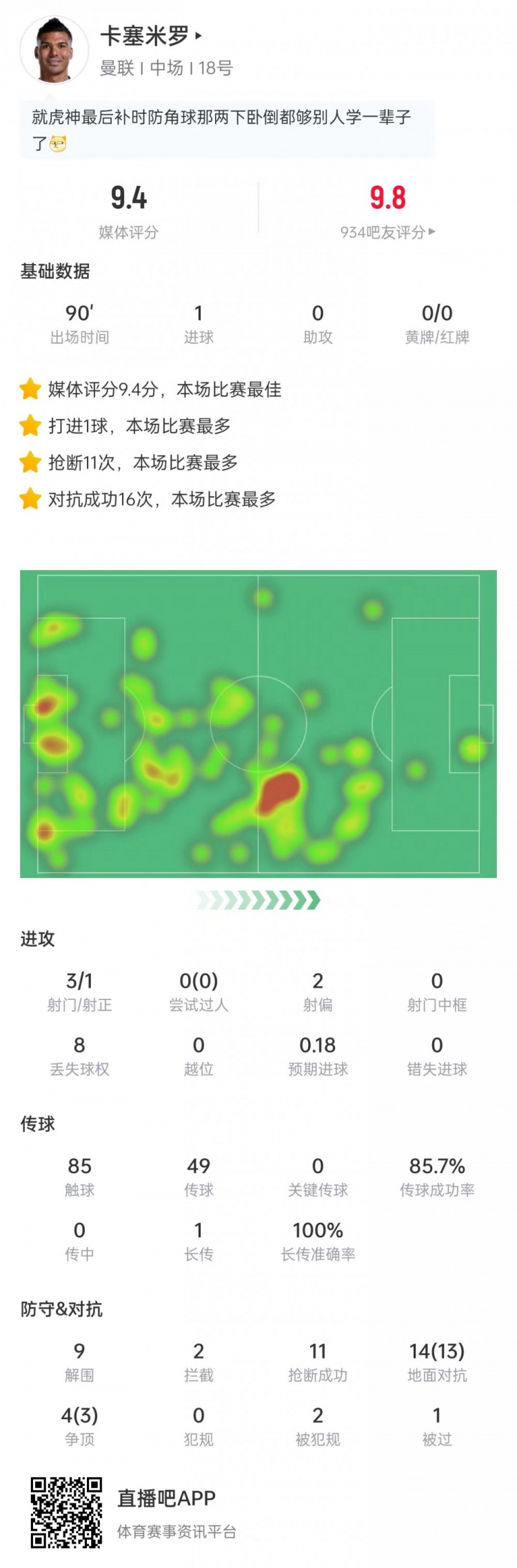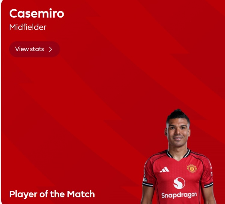 此役卡塞米罗为曼联踢满全场,打进一球,他当选英超官方本场比赛最佳球员。