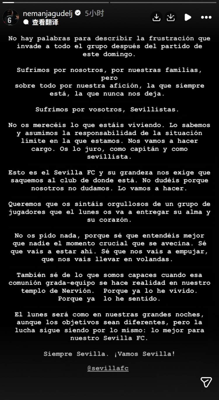你们不该承受如今所经历的一切,我们深知这一点,并将承担起将球队从当前绝境中解救出来的责任,我发誓,作为队长,也作为一名塞维利亚人,我们会扛起重任。