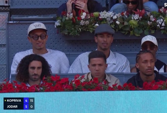 04月28日讯 切尔西三位球员恩佐、库库雷利亚和若昂·佩德罗3人观战马德里大师赛正好坐在贝林厄姆一家前排。