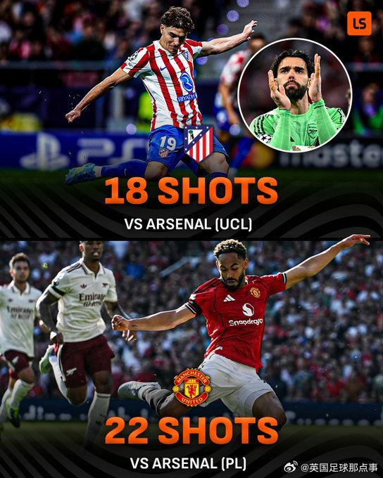 LiveScore:马竞和曼联是本赛季在单场比赛中对阿森纳完成最多射门的两支球队