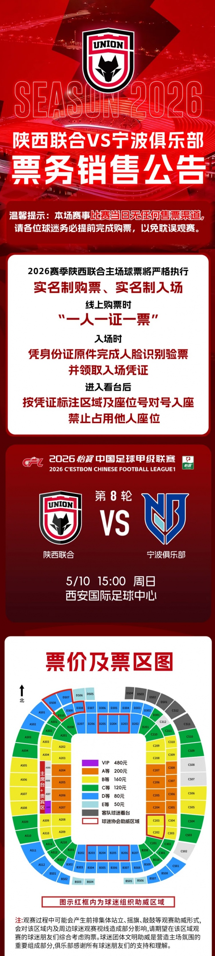 2026赛季中甲联赛(第8轮)陕西联合主场赛事单场售票将于5月1日10:00根据会员等级陆续开启;本场赛事票务销售将于5月9日(赛前1天)18:00停止。截止时间后,线上线下渠道将均无余票可售,请广大球迷注意时间节点,同时避免上当受骗。
